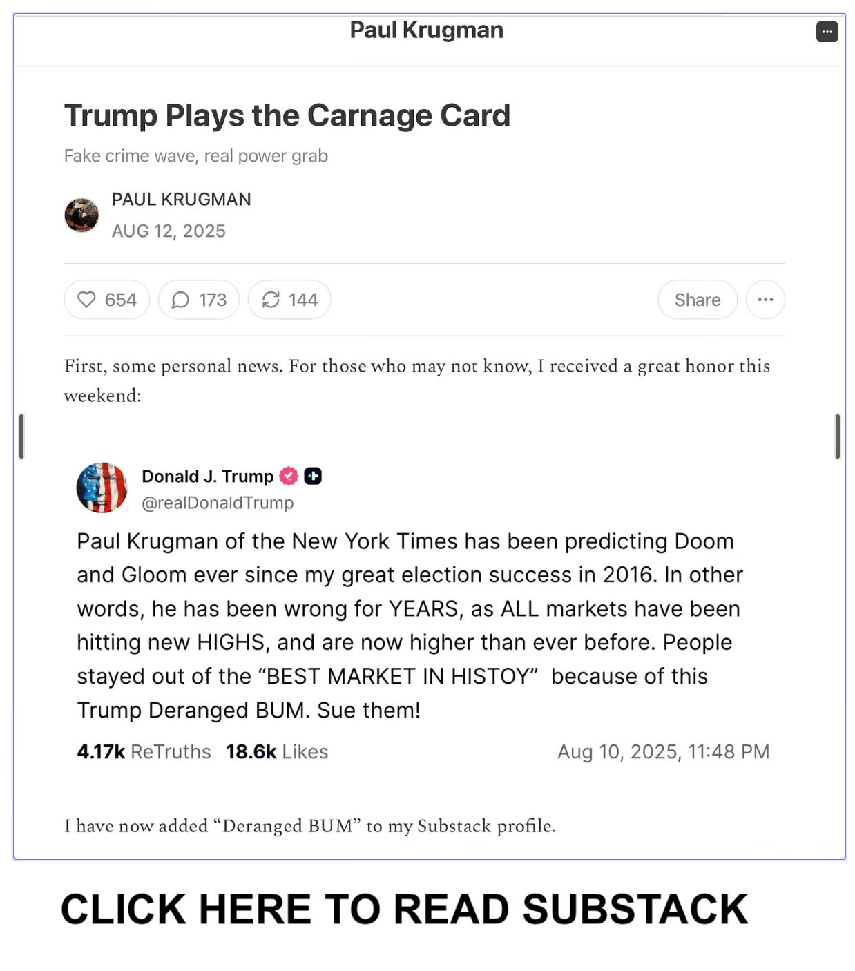 I’m not in competition with Krugman for click. His Substack today, as I write this, got 925 hearts, 240 comments, and 175 restacks.